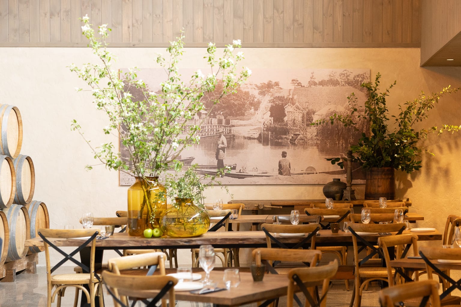 At the heart of the estate is our purpose-built Barrel Hall — a dedicated tasting and event space with high ceilings, barrel stacks and cast-iron chandeliers.