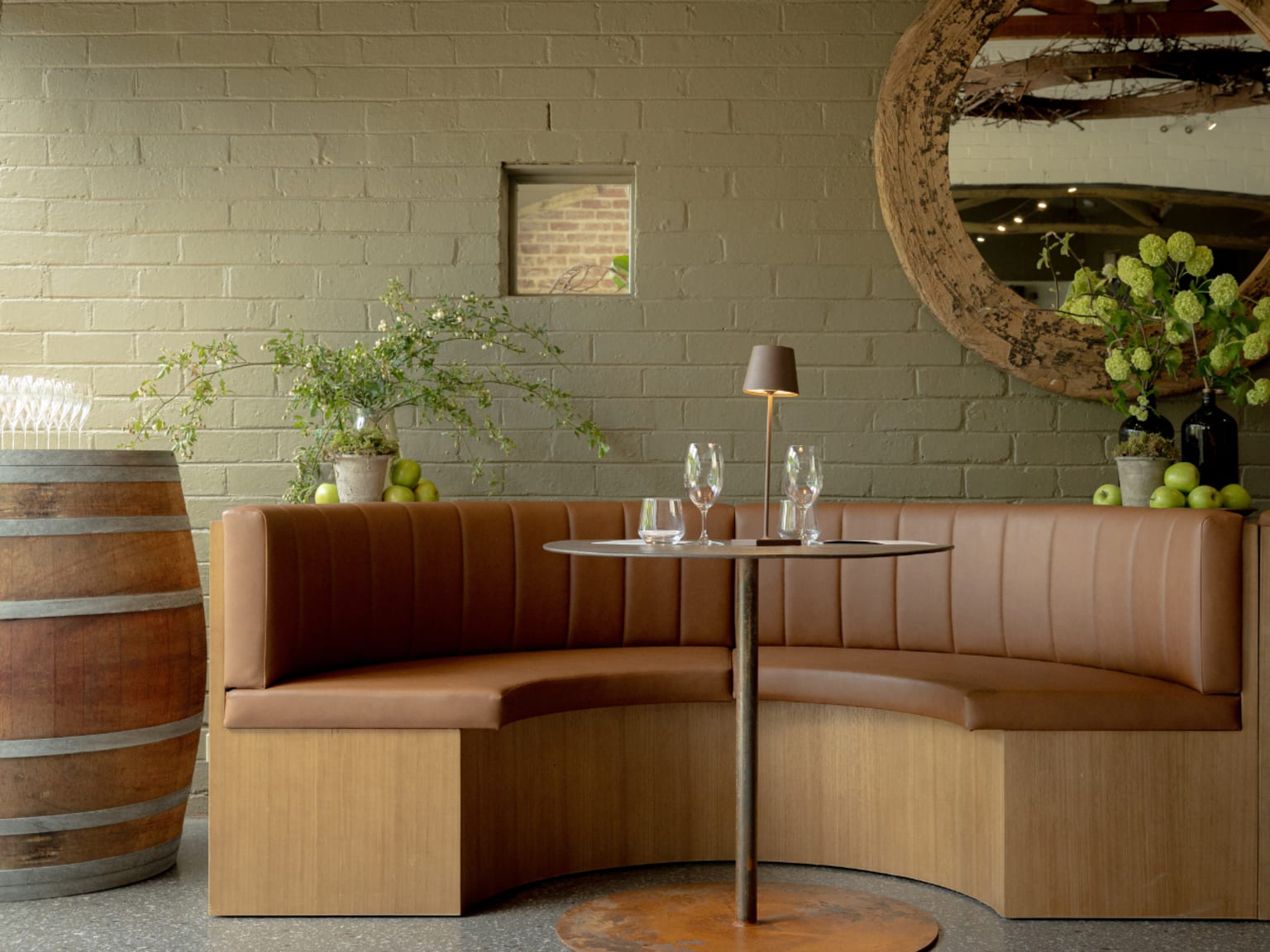 Our new home sits at the centre of the estate beside Meletos and The Farmhouse accommodation, surrounded by vineyards and orchards. Designed to bring people together, it features a barrel hall, cast iron chandeliers, and spaces to linger and savour the beauty of the Yarra Valley.